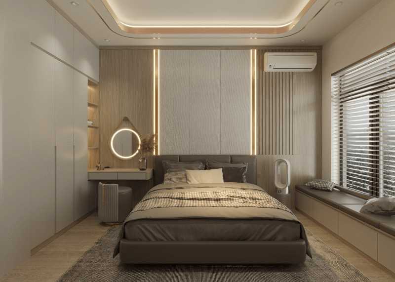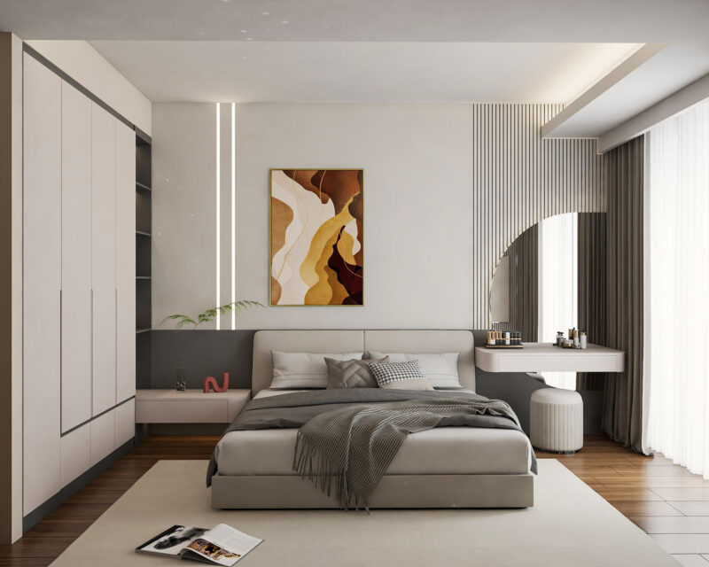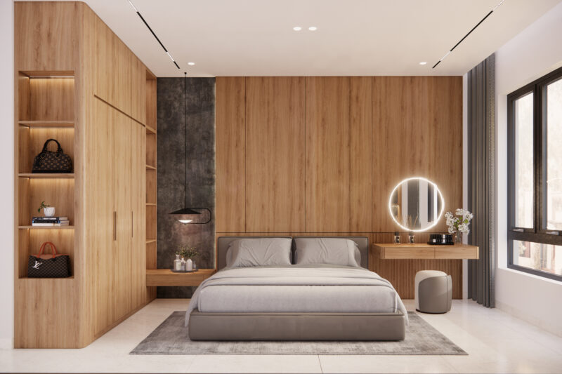 Việc lựa chọn tủ quần áo kết hợp với bàn trang điểm là giải pháp thông minh cho phòng ngủ hiện đại nhờ khả năng tối ưu hoá diện thích tuyệt đối. Sự kết hợp này tạo nên một hệ thống đồng nhất, xoá bỏ các khoảng hở lãng phí giữa các món nội thất rời giúp căn phòng trở nên liền mạch, gọn gàng và rộng rãi hơn.