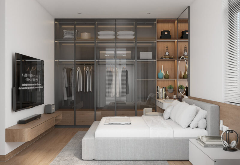 Đối với các phòng ngủ có diện tích nhỏ, sử dụng tủ quần áo liền bàn trang điểm theo phong cách tối giản được xem là giải pháp giúp tiết kiệm không gian hiệu quả. Loại tủ này thường có nhiều ngăn kéo và kệ nhỏ để cung cấp không gian lưu trữ cần thiết. Bên cạnh đó, bàn trang điểm cũng được tích hợp với tủ quần áo để giúp căn phòng rộng rãi, thoáng đãng hơn.