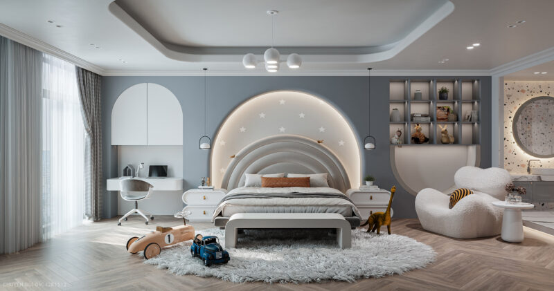 Phòng ngủ Luxury cho trẻ em năm 2026 kết hợp hoàn hảo giữa vật liệu hữu cơ an toàn và công nghệ sáng tạo, sử dụng gam màu pastel tinh tế làm chủ đạo. Điểm nhấn nằm ở các thiết kế nội thất bo tròn, trần xuyên sáng hiệu ứng bầu trời sao và khu vực học tập thông minh, tạo nên một không gian vừa đẳng cấp, vừa kích thích trí tưởng tượng của bé.