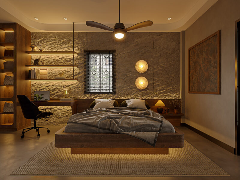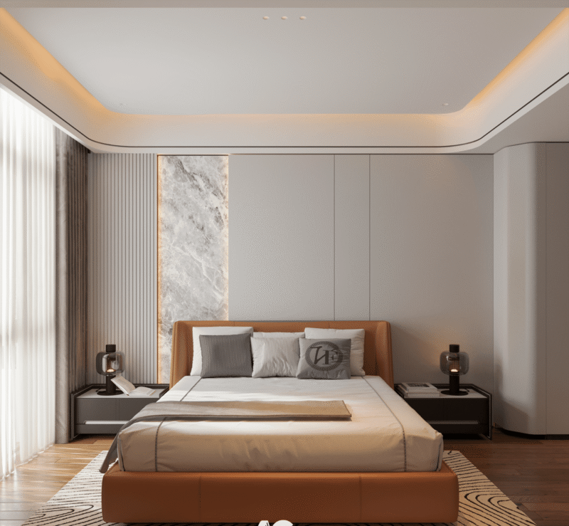 Không gian sẽ trở nên lung linh gấp bội khi bạn bố trí ánh sáng gián tiếp. Đèn LED dây ẩn sau đầu giường hoặc dưới gầm giường tạo hiệu ứng lơ lửng, huyền ảo, giúp xóa tan sự khô cứng của nội thất gỗ.