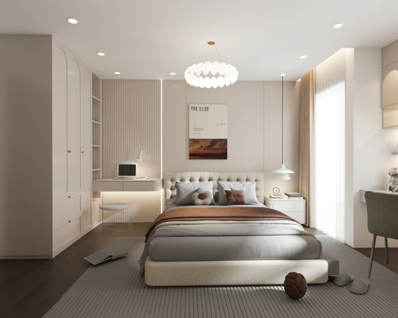 Giường ngủ và bộ chăn ga chính là trái tim quyết định 80% diện mạo lẫn chất lượng nghỉ ngơi của phòng ngủ. Một chiếc giường có thiết kế vững chãi, kết hợp cùng bộ chăn ga từ chất liệu tự nhiên như Cotton hay Silk không chỉ nâng tầm thẩm mỹ mà còn là điểm tựa cho những giấc ngủ sâu. Việc lựa chọn màu sắc chăn ga đồng điệu với tông màu chủ đạo của căn phòng giúp tạo nên một tổng thể hài hòa, biến nơi đây thành một không gian thư giãn nơi bạn có thể rũ bỏ mọi mệt mỏi ngay khi vừa ngả lưng.
