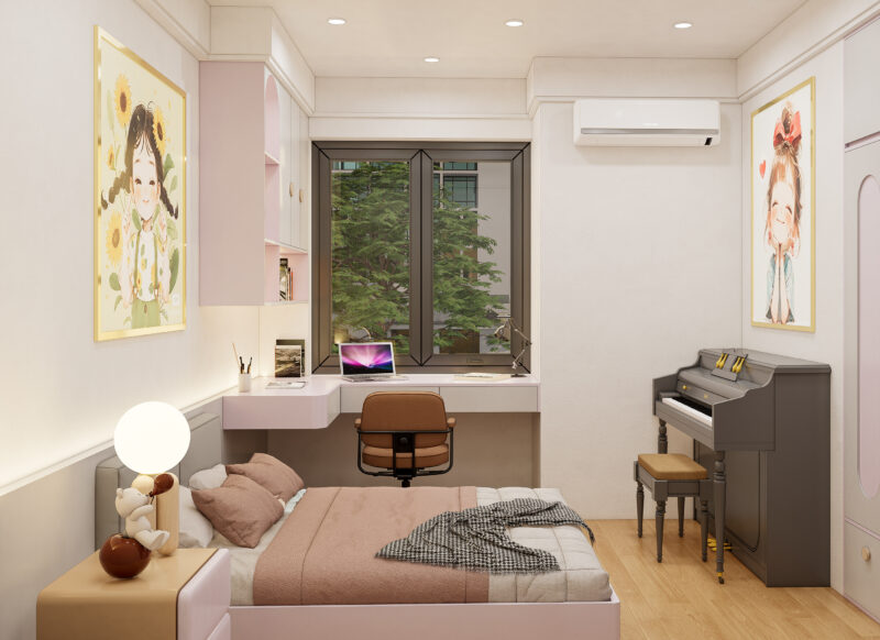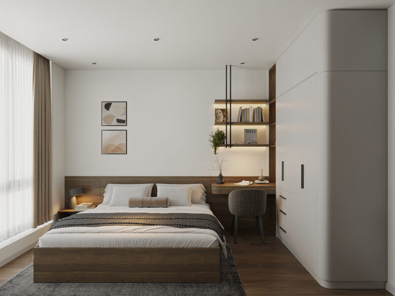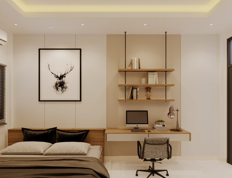 • Phân chia khu vực hợp lý: Nếu phòng ngủ tích hợp góc làm việc, hãy sử dụng đồ decor (như thảm hoặc kệ sách) để phân tách rõ ranh giới, giúp não bộ tách biệt được không gian nghỉ ngơi và không gian áp lực.
