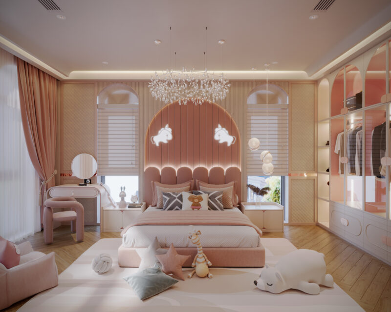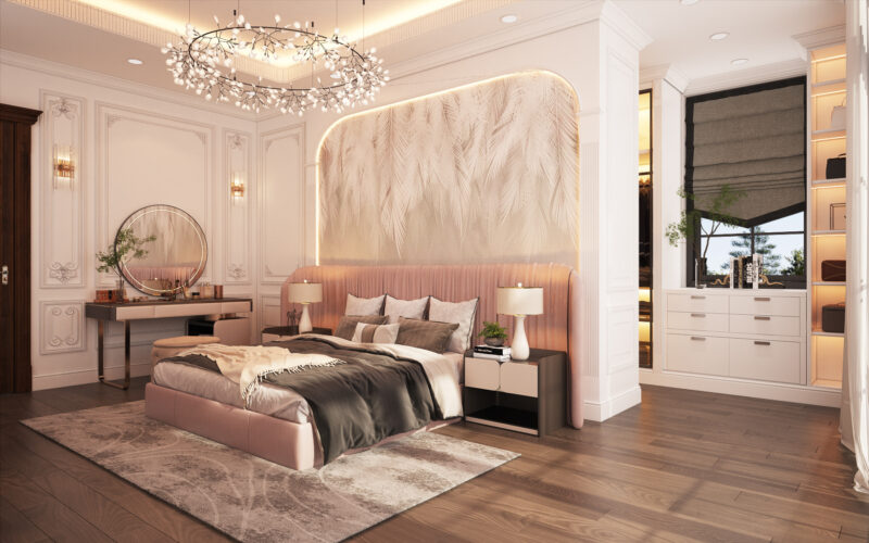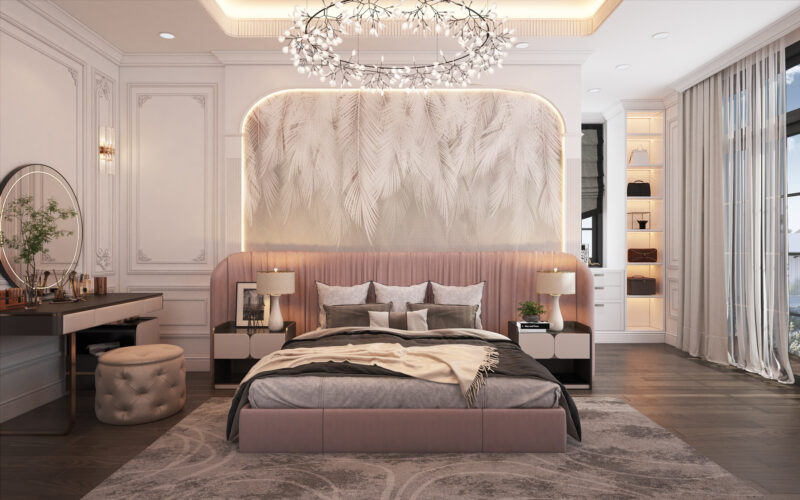 Thiết kế phòng ngủ tông hồng Pastel là lựa chọn hoàn hảo cho những ai yêu thích sự ngọt ngào, tinh tế mà vẫn giữ được nét hiện đại, không bị quá sến. Phòng ngủ được thiết kế với tông màu hồng pastel kết hợp tường màu phấn mịn với nội thất gỗ sáng và ánh sáng tự nhiên để tạo không gian thư giãn. Sự hoà quyện cùng các tông trắng, xám hoặc vàng dồng giúp căn phòng trở nên hiện đại và sang trọng. Điểm nhấn từ các chất liệu nhung, voan và tranh nghệ thuật tối giản mang lại vẻ đẹp tinh tế, ngọt ngào cho gia chủ.