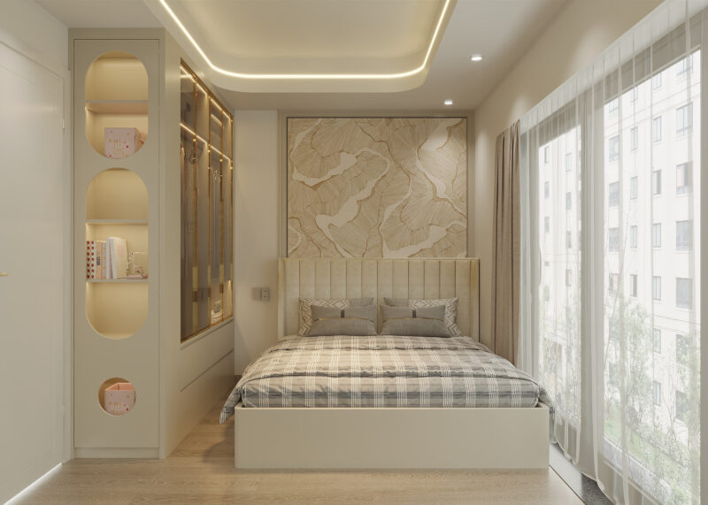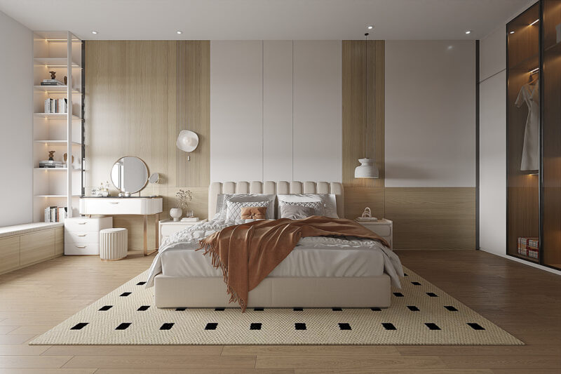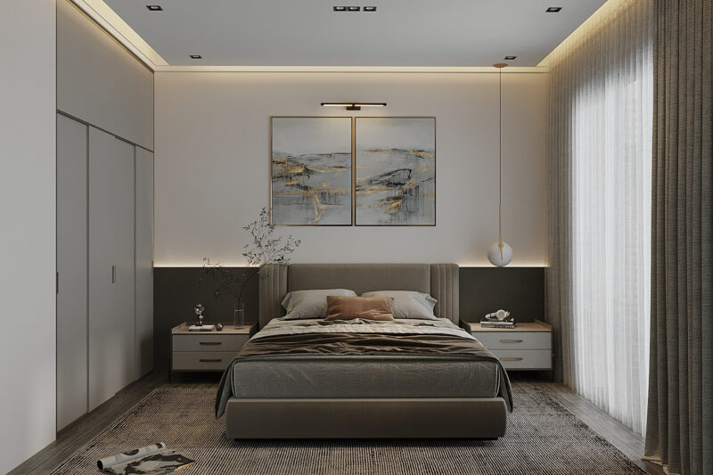 - Tạo điểm nhấn tinh tế: Sử dụng tranh nghệ, cây xanh hoặc thảm trải sàn để tạo điểm nhấn mang đến không gian phòng ngủ tinh tế trong trong từng chi tiết nhỏ.