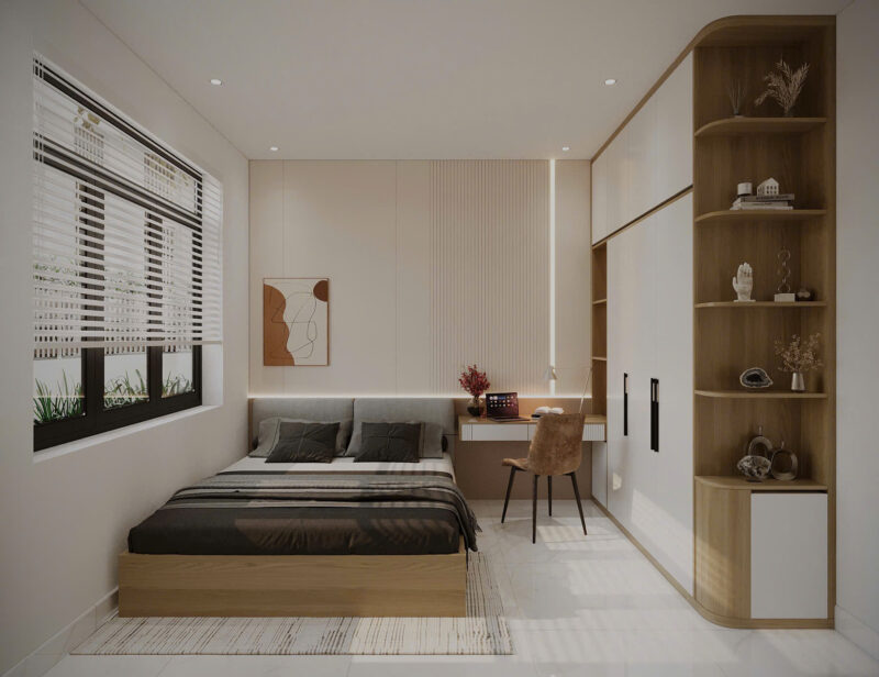Phòng ngủ tông màu be là lựa chọn hàng đầu cho những ai yêu thích phong cách tối giản (Minimalism) hoặc phong cách Zen bởi phong cách này mang đến sự bình yên và vẻ đẹp vượt thời gian mà nó mang lại. Gam màu này đóng vai trò là một lớp nền trung tính hoàn hảo, giúp không gian trở nên rộng rãi, sáng sủa và dễ dàng bắt trọn ánh sáng tự nhiên từ cửa sổ.