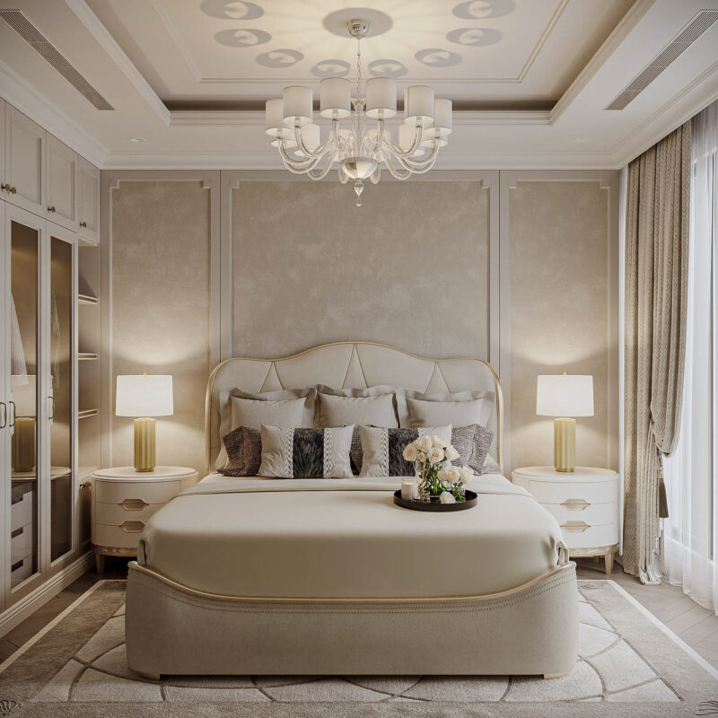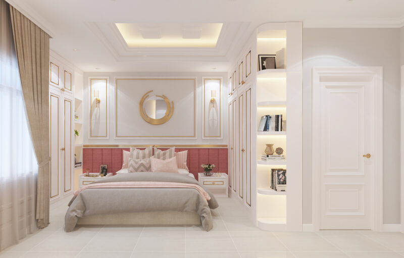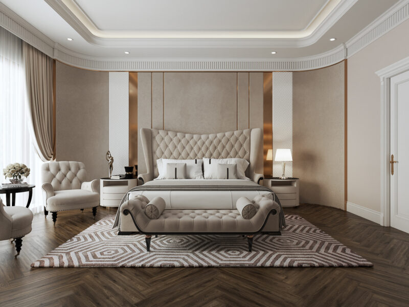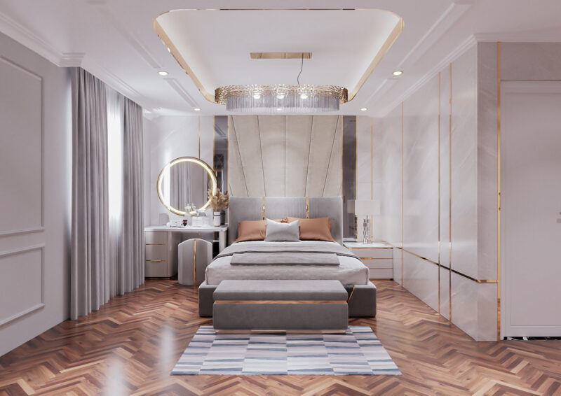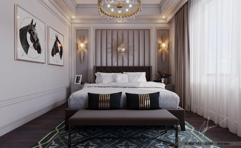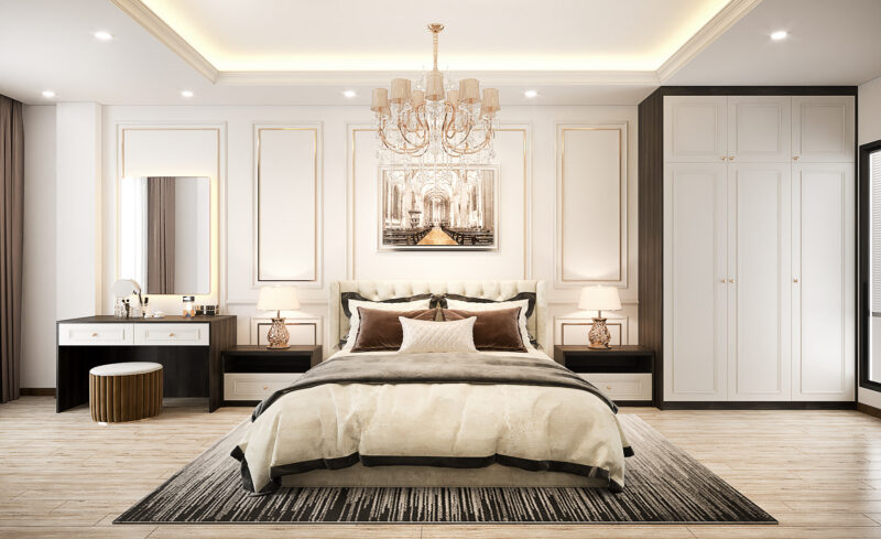 Phong cách này chú trọng vào vật liệu quý hiếm như gỗ óc chó, đá cẩm thạch tự nhiên, da thật và các chi tiết dát vàng thủ công để khẳng định vị thế gia chủ. Không gian được thiết kế theo tỷ lệ vàng nghiêm ngặt, kết hợp hệ thống ánh sáng đa lớp từ đèn chùm pha lê và đèn hắt nghệ thuật nhằm tôn vinh từng đường nét phào chỉ trên trần và tường. Tổng thể không gian không chỉ mang vẻ đẹp vương giả, uy nghi mà còn mang đến trải nghiệm nghỉ dưỡng thượng lưu, nơi sự tiện nghi hiện đại hòa quyện hoàn hảo trong diện mạo cổ điển kiêu kỳ.