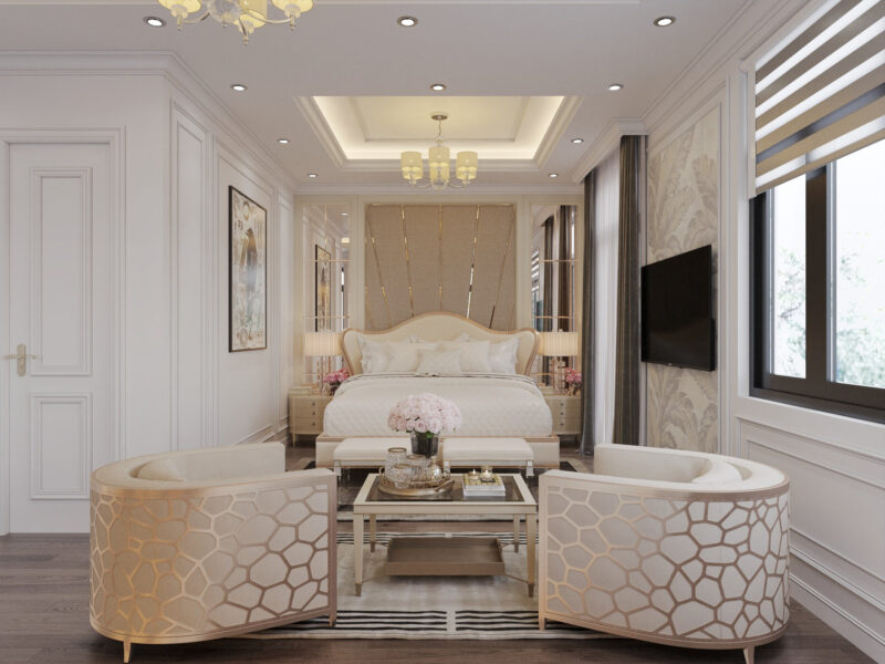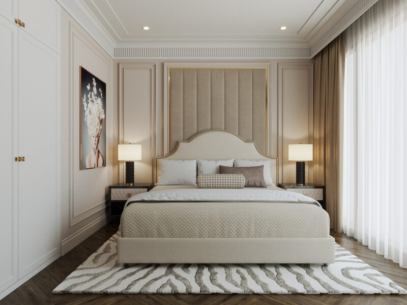 Thiết kế Tân cổ điển Châu Âu là sự kết hợp giữa tỷ lệ đối xứng nghiêm ngặt và đường nét thanh thoát. Điểm cốt lõi nằm ở những mảng tường chia ô bằng phào chỉ tinh tế, làm nền cho các món nội thất có đường cong mềm mại nhưng không quá rườm rà. Phong cách này sử dụng bảng màu trung tính quý phái, kết hợp cùng chất liệu cao cấp như da, nhung và kim loại mạ vàng để tạo nên một không gian vừa mang hơi thở vương giả, vừa đảm bảo sự thanh lịch, hiện đại.