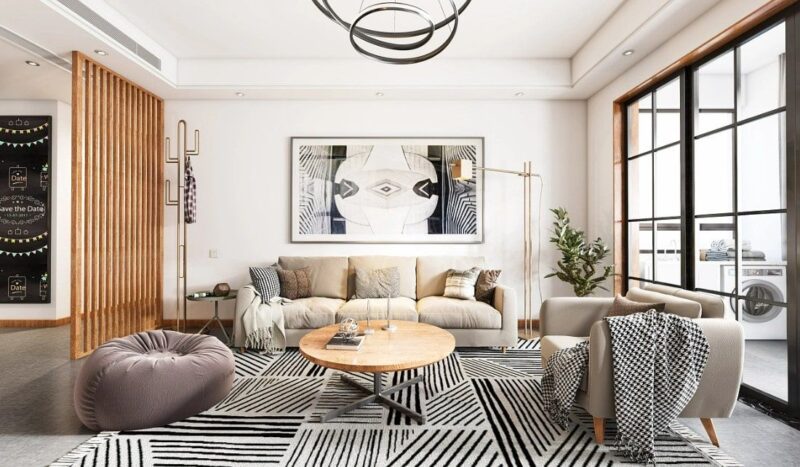 Mẫu phòng khách mang đến sự cân bằng hoàn hảo giữa tính thẩm mỹ hiện đại và cảm giác ấm cúng. Mẫu phòng khách này ưu tiên vật liệu từ thiên nhiên như gỗ sáng màu kết hợp với vải dệt thô, len và lông thú. Màu sắc nền thường là màu trắng hoặc xám nhạt làm nổi bật ánh sáng tự nhiên. Phong cách này không chỉ đẹp mà còn tạo ra không gian thư giãn, gần gũi lý tưởng cho các gia đình trẻ.