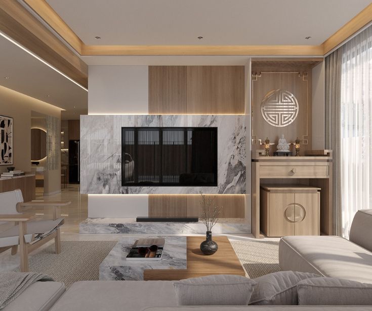 Phong cách này là sự kết hợp giữa nét truyền thống, trang nghiêm của khu vực thờ cũng và sự ấm cúng, thân thiện của phòng khách. Thiết kế sử dụng các vật liệu gỗ công nghiệp cao cấp với ánh sáng dịu nhẹ và các mảng màu trầm ấm tạo nên một không gian tĩnh. lặng tôn kính nhưng vẫn hoà hợp gần gũi với sinh hoạt hằng ngày.