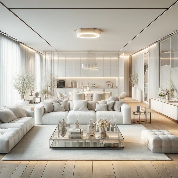 Đây là giải pháp hiện đại và linh hoạt nhất đặc biệt cho các căn hộ có diện thích khiêm tốn. Mẫu phòng này được kết nối liền mạch với bếp hoặc phòng ăn, loại bỏ vách ngăn cứng. Để phân định khu vực các nhà thiết kế thường sử dụng thảm, hệ thống đèn chiếu sáng hoặc quầy bar. Sự liền mạch này giúp tối đa hoá ánh sáng tự nhiên, tăng cường sự giao tiếp giữa các thành viên và làm cho không gian có cảm giác rộng rãi hơn đáng kể.