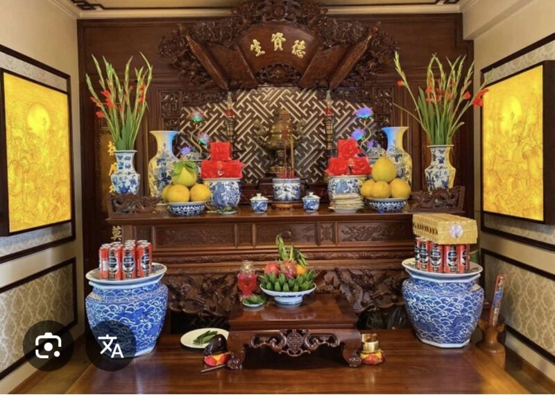 Bàn thờ cần được bố trí gọn gàng, cân xứng để tạo thế vững vàng và tụ khí tốt. Bát hương đặt ở vị trí trung tâm, phía trước là chén nước hoặc rượu, bánh mứt, lễ vật. Hai bên đặt đèn hoặc nến tượng trưng cho mặt trời – mặt trăng, giúp cân bằng âm dương.