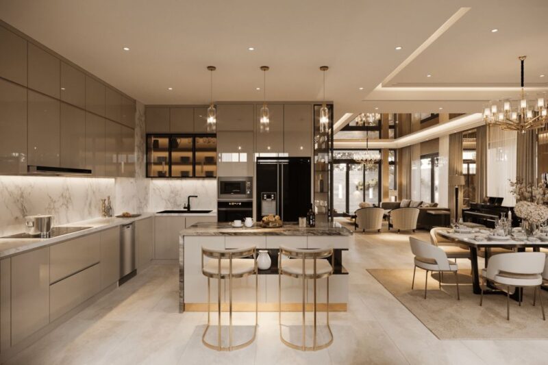 Bạn có thể thiết kế mẫu tủ bếp màu trắng tinh khôi kết hợp với các ánh kim nhẹ nhàng để tạo nên điểm nhấn sang trọng. Các mẫu tủ ánh kim giúp tổng thể căn bếp trở nên sang trọng, sạch sẽ và gọn gàng. Do đó, đây là một ý tưởng tuyệt vời giúp căn bếp của bạn trông hiện đại và sang trọng hơn.