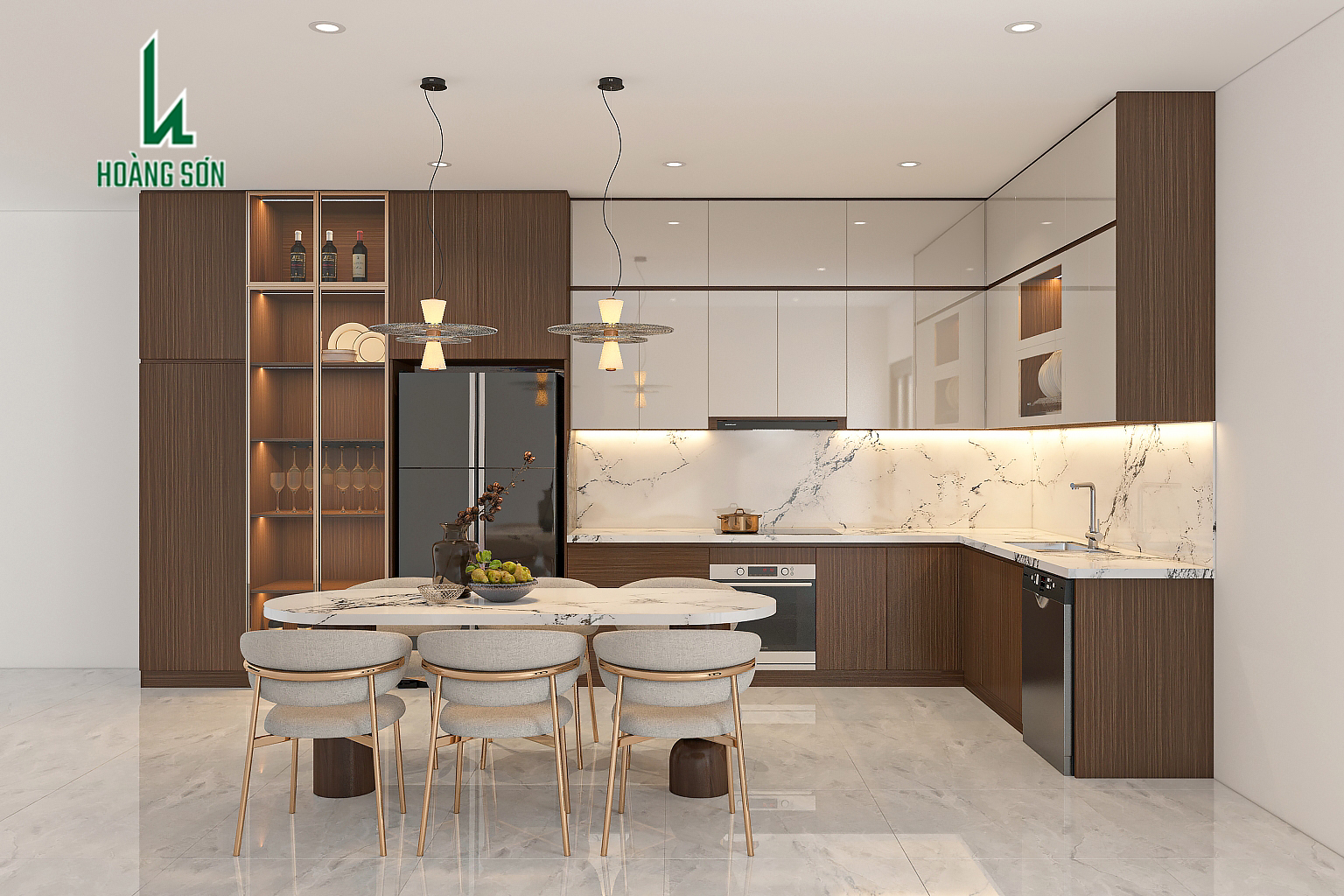 Không gian bếp được thiết kế theo phong cách hiện đại, kết hợp với hơi hướng tối giản, thể hiện qua đường nét vuông vức, bố cục gọn gàng và bảng màu trung tính. Sự phối hợp giữa tông trắng – nâu gỗ tạo cảm giác ấm cúng nhưng vẫn sang trọng, phù hợp với căn hộ hoặc nhà phố hiện đại.