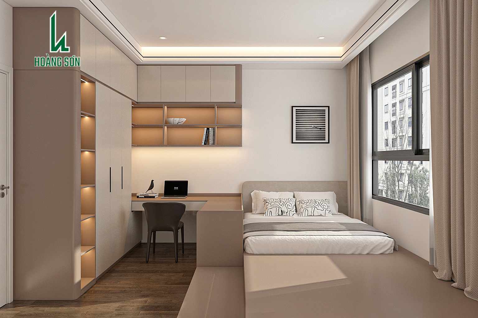 - Tổng thể thiết kế phòng ngủ hướng đến sự tối giản, tiện nghi và tối ưu diện tích, phù hợp với căn hộ chung cư hoặc nhà phố hiện đại. Sự kết hợp hài hoà giữa màu sắc trung tính, vật liệu gỗ công nghiệp và hệ nội thất thông minh giúp không gian vừa đẹp mắt vừa đáp ứng đầy đủ nhu cầu sinh hoạt hằng ngày.NỘI THẤT HOÀNG SƠN | Thiết kế – Sản xuất – Thi công