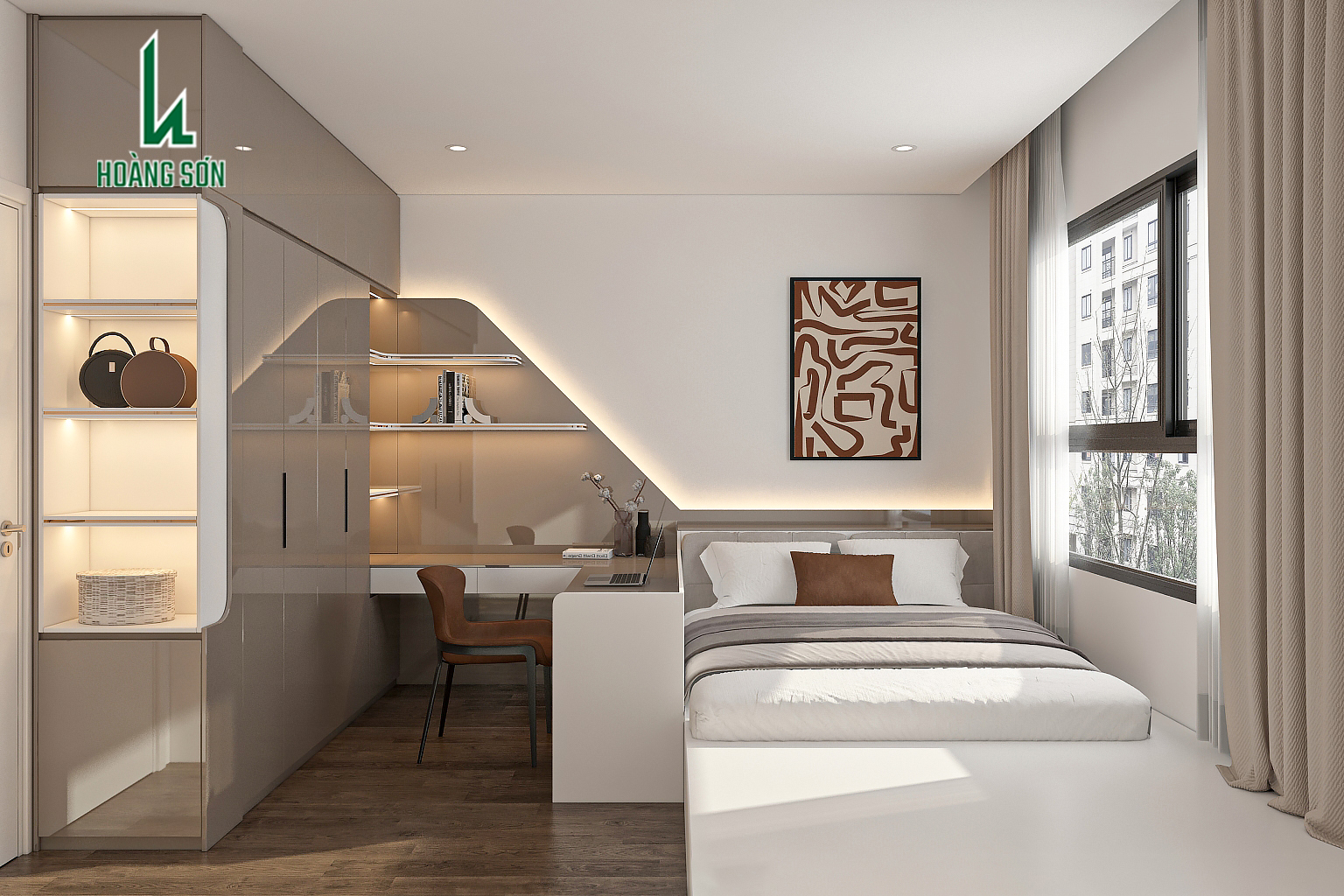 Phòng ngủ trong hình được thiết kế theo phong cách hiện đại, tối giản tập trung vào sự gọn gàng, tinh tế và tối ưu công năng cho không gian nhỏ. Tông màu chủ đạo là beige, trắng kem và nâu gỗ tạo cảm giác ấm cúng, thư giãn và sang trọng. Hệ tủ, bàn làm việc và giường ngủ được thiết kế liền khối giúp tiết kiệm diện tích và tăng tính thẩm mỹ tổng thể.