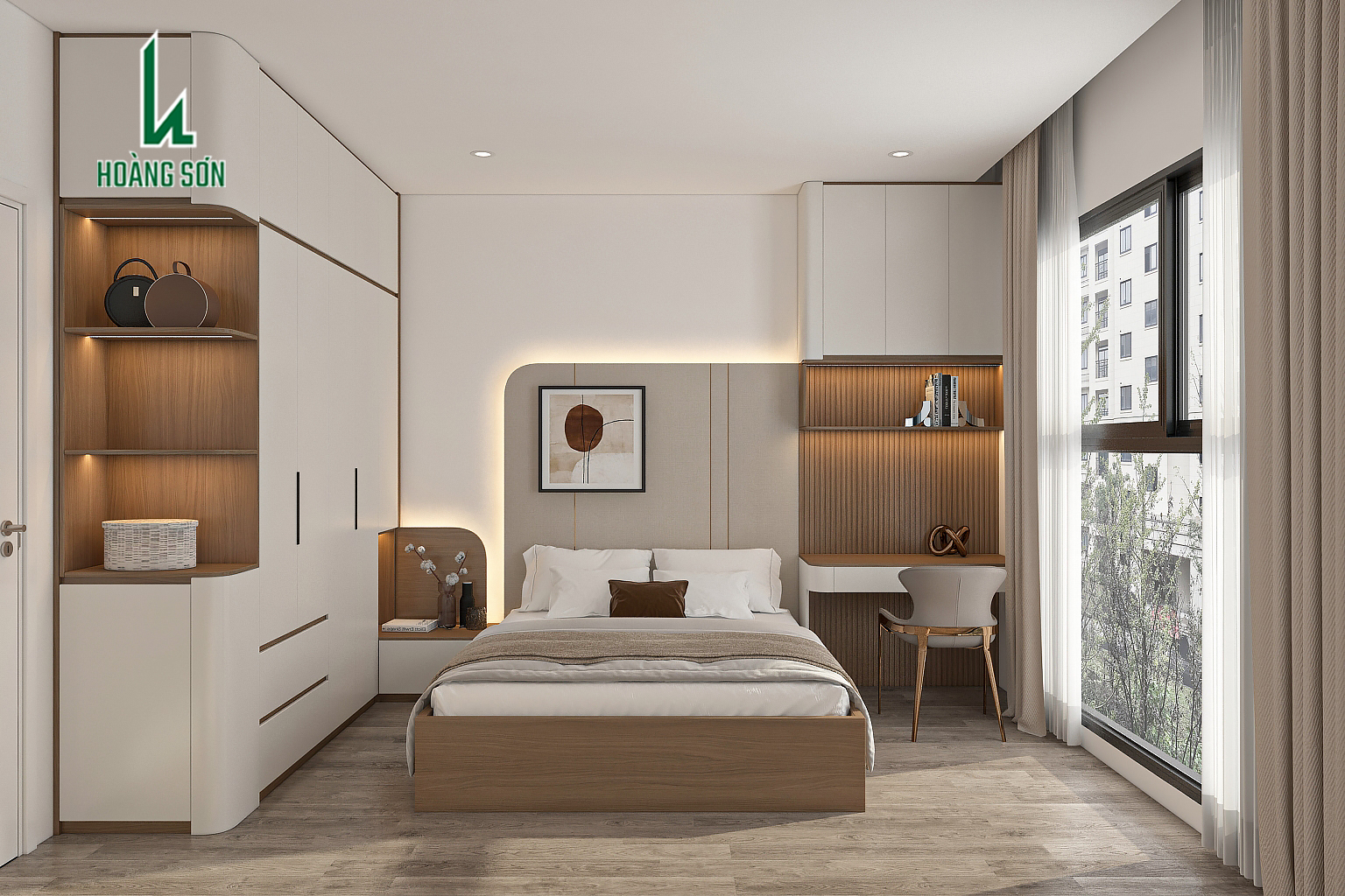 Phòng ngủ được thiết kế theo phong cách hiện đại, tối giản sử dụng tông màu trung tính như trắng, be và vân gỗ sáng tạo cảm giác ấm áp, nhẹ nhàng và thư giãn. Không gian được bố trí gọn gàng, tối ưu công năng nhưng vẫn đảm bảo tính thẩm mỹ, phù hợp với tất cả các căn hộ chung cư hoặc nhà phố hiện đại.