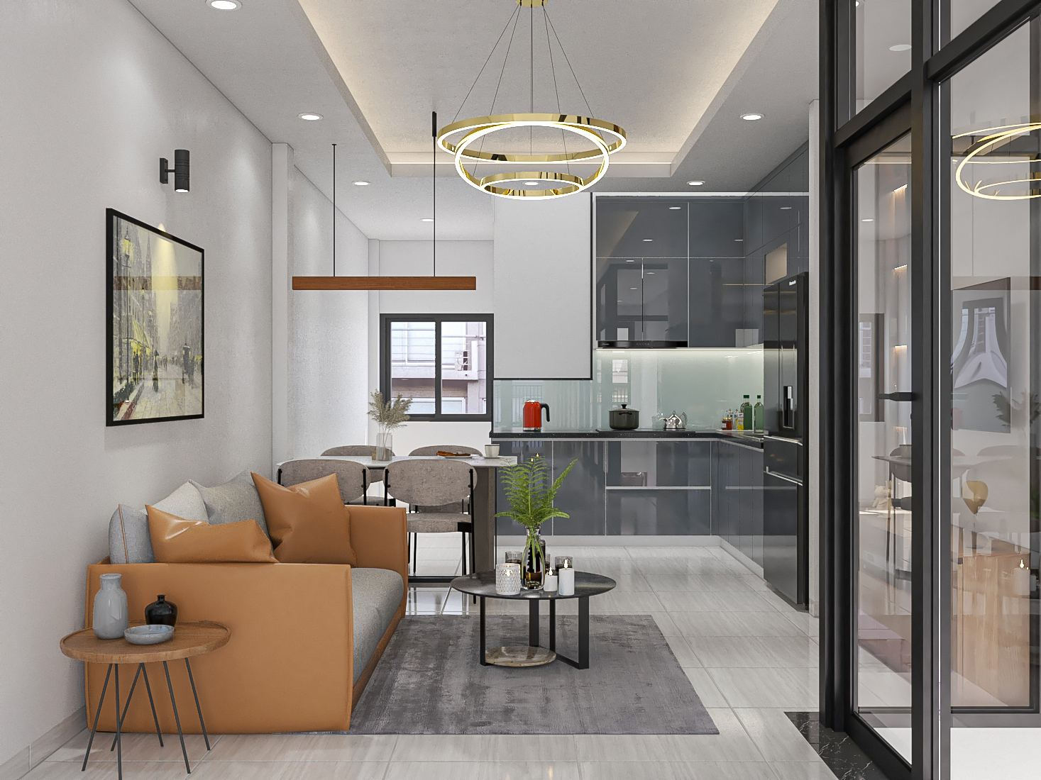 - Phòng bếp được thiết kế ấm cúng, trang nhã: Sofa màu nâu da bò kết hợp gối trang trí trung tính tạo điểm nhấn ấm áp. Bàn trà mặt tròn tối giản đặt trên thảm lông xám, giúp định hình khu vực tiếp khách.Tranh treo tường phong cách châu Âu tạo nét nghệ thuật cho không gian. Hệ đèn trang trí vòng tròn kim loại vàng sang trọng, mang lại ánh sáng mềm mại và hiện đại.