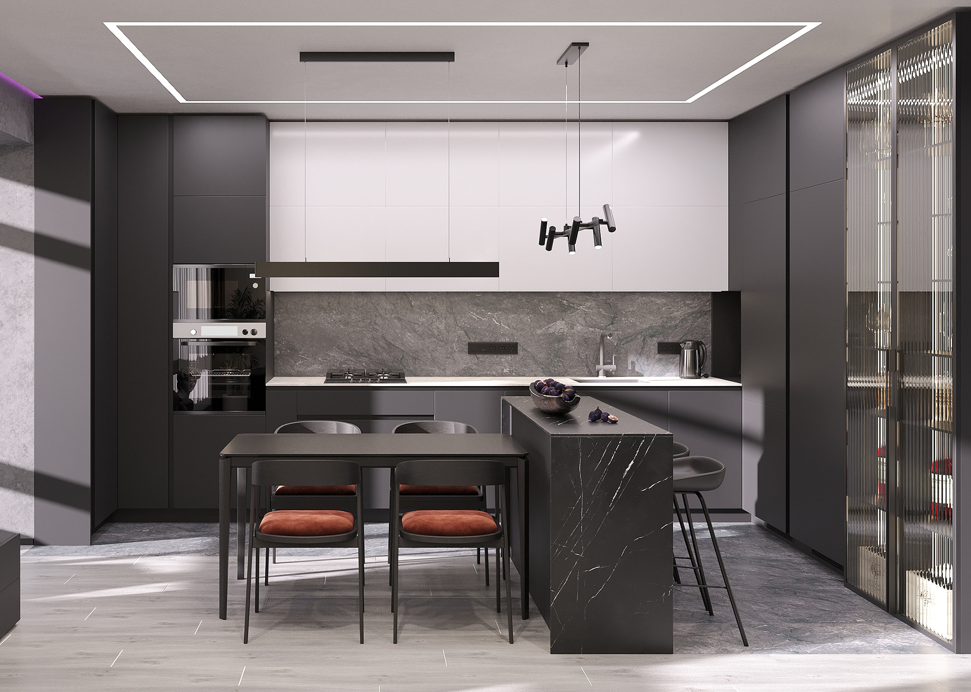 - Sự kết hợp giữa gam màu đen – trắng – xám cùng chất liệu đá vân mây cao cấp giúp tổng thể trở nên mạnh mẽ, thanh lịch nhưng không kém phần ấm áp