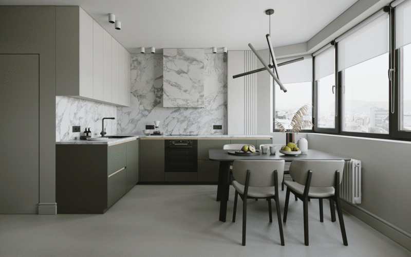 Tủ bếp được thiết kế theo phong cách hiện đại với tone màu xanh nhẹ nhàng, tinh tế và sang trọng