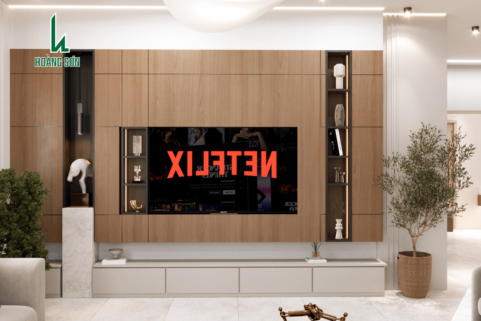 - Tivi được lắp âm tường tạo bố cục gọn gàng đồng thời là trung tâm thu hút mọi mọi ánh nhìn trong phòng khách.