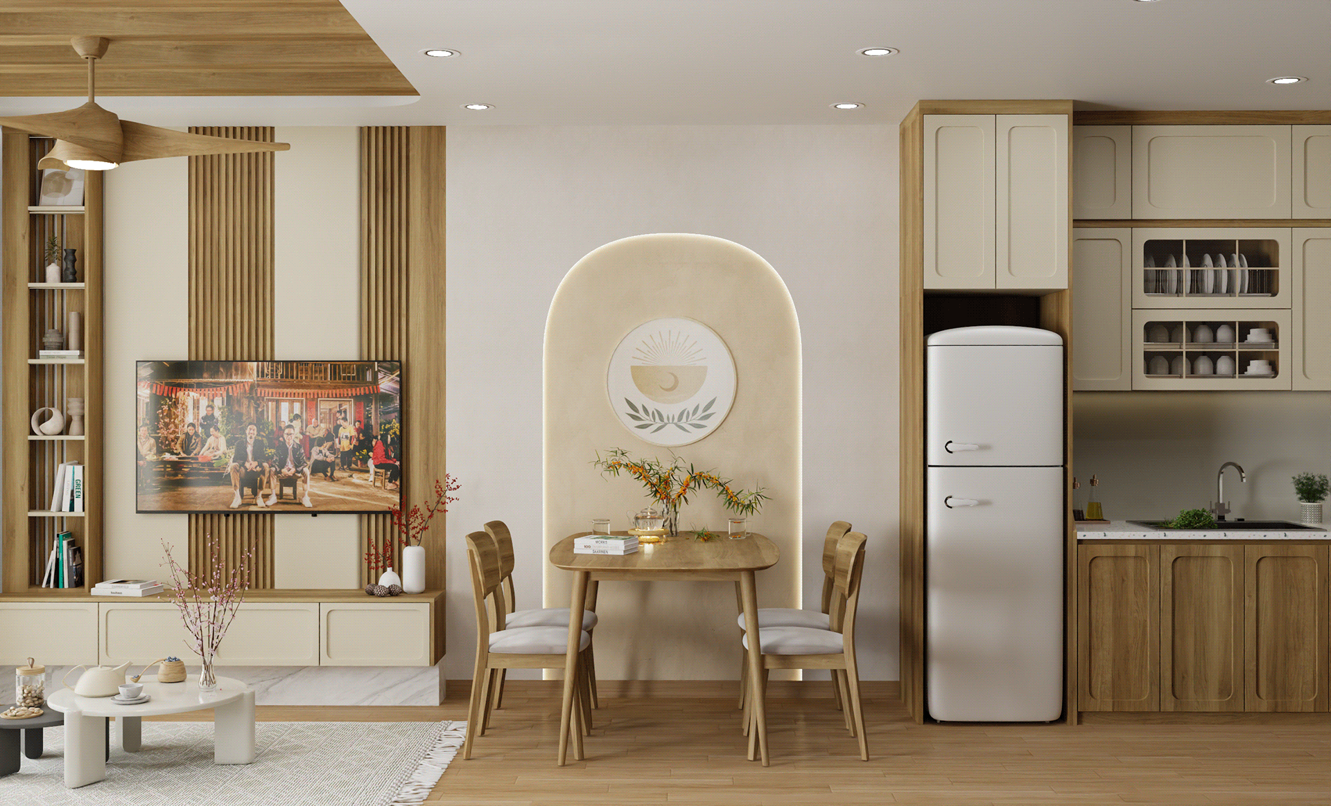 - Bàn trà thấp, ghế gỗ và các món decor đơn giản mang lại cảm giác gần gũi phù hợp với nhịp sống hiện đại