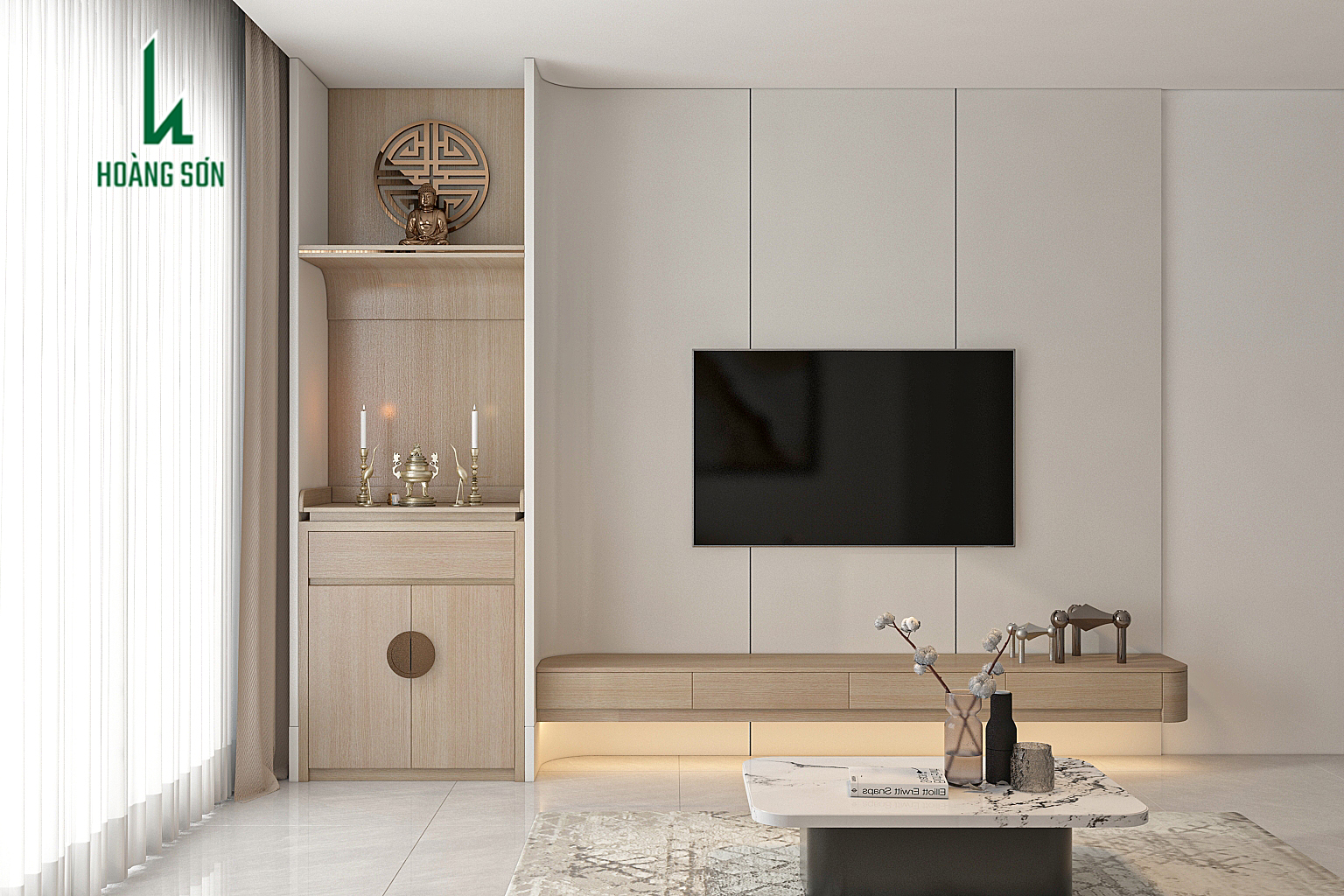 - Điểm đắt giá nhất là hệ bàn thờ được đặt trang trọng ở vị trí bên trái. Thay vì dạng treo, mẫu này sử dụng tủ thờ đứng kịch trần với thiết kế tối giản. Việc đặt bàn thờ trong một hộc riêng biệt giúp tạo không gian tĩnh lặng, trang trọng tuyệt đối. Có vách ngăn bo cong uyển chuyển tại điểm giao giữa tủ thờ và vách tivi tạo sự riêng tư và tôn nghiêm mà vẫn đồng bộ với tổng thể.