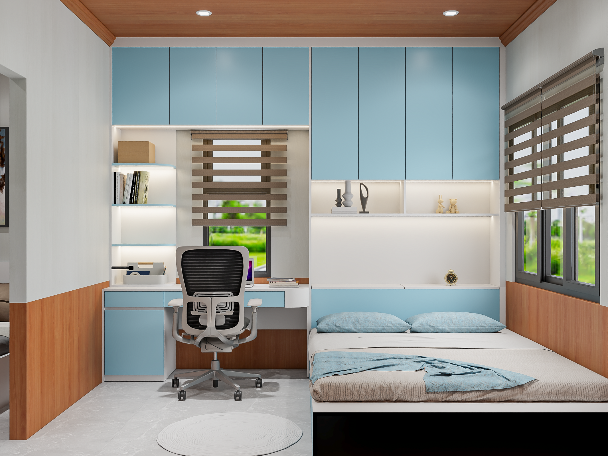 Căn phòng sử dụng tông xanh baby (pastel blue) làm chủ đạo cho hệ tủ, kết hợp cùng sắc trắng tinh khôi và màu gỗ sáng tự nhiên. Sự kết hợp này không chỉ tạo cảm giác mở rộng không gian mà còn mang lại tâm trạng thư thái, dễ chịu cho chủ nhân sau một ngày làm việc căng thẳng.