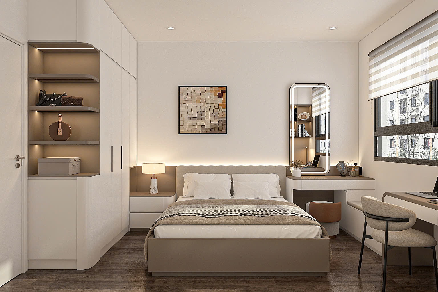 Bố cục thông minh: Cách sắp xếp nội thất theo dạng “liền mạch” từ tủ quần áo đến bàn trang điểm và bàn làm việc giúp tận dụng tối đa diện tích, tạo ra một dòng chảy không gian xuyên suốt.