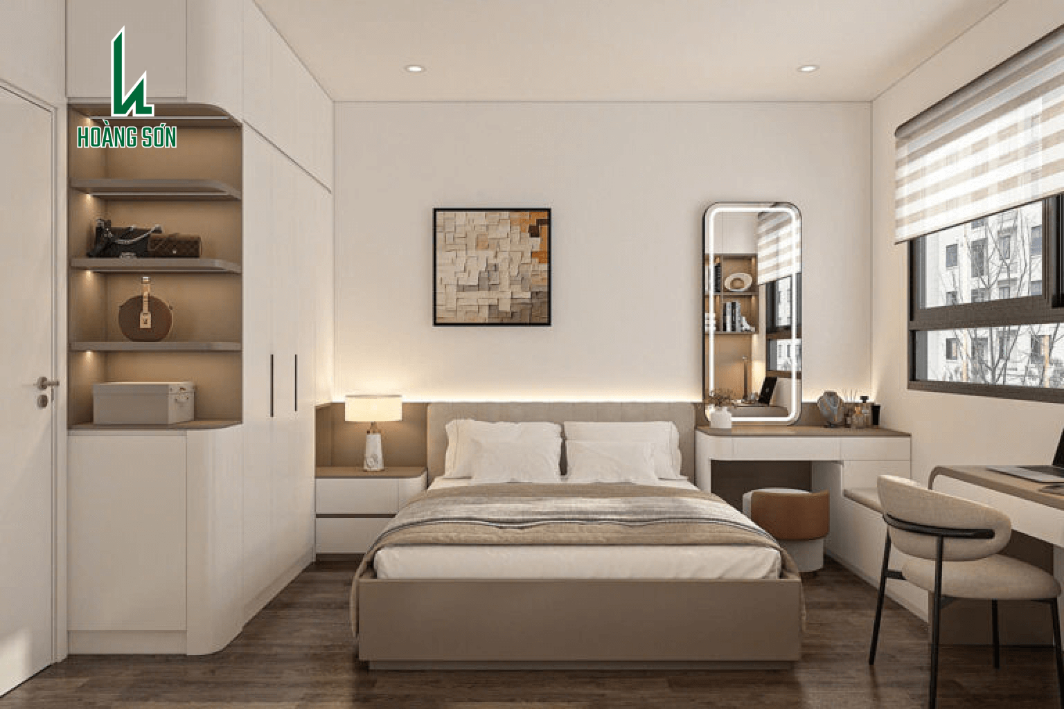 - Phòng ngủ sử dụng phong cách thiêt kế hiện đại, tối giản sang trọng và giúp tối ưu hoá không gian. Việc sử dụng các đường nét thẳng, phẳng và hình khối vương vức tạo nên sự gọn gàng Tuy nhiên, các góc cạnh của hệ tủ và bàn trang điểm được bo tròn nhẹ nhàng để giảm bớt sự cứng nhắc, tạo cảm giác an toàn và mềm mại.