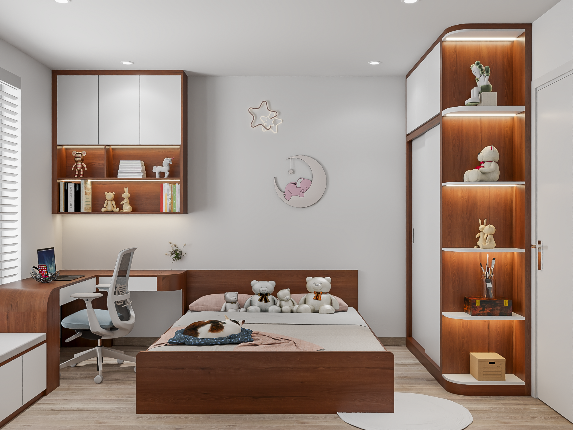 - Giường ngủ đa năng: Giường gỗ với thiết kế tối giản, đi kèm các chú gấu bông trang trí trên giường, tạo cảm giác thân thiện, dễ thương và phù hợp với không gian dành cho trẻ nhỏ.