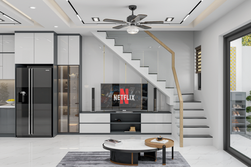 - Không gian phòng khách được thiết kế hiện đại, tối giản và đầy sang trọng: Phòng khách sử dụng bộ kệ tivi âm tường bố trí gọn gàng ngay dưới gầm cầu thang. Thiết kế này giúp tiết kiệm diện tích đồng thời tạo điểm nhấn ấn tượng cho tổng thể ngôi nhà