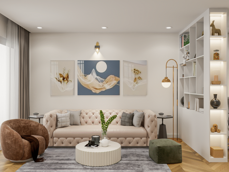 - Kệ trang trí âm tường – Tăng không gian trưng bày: Bên phải phòng khách là hệ kệ âm tường kết hợp đèn LED, vừa mang tính trang trí vừa tối ưu công năng lưu trữ.