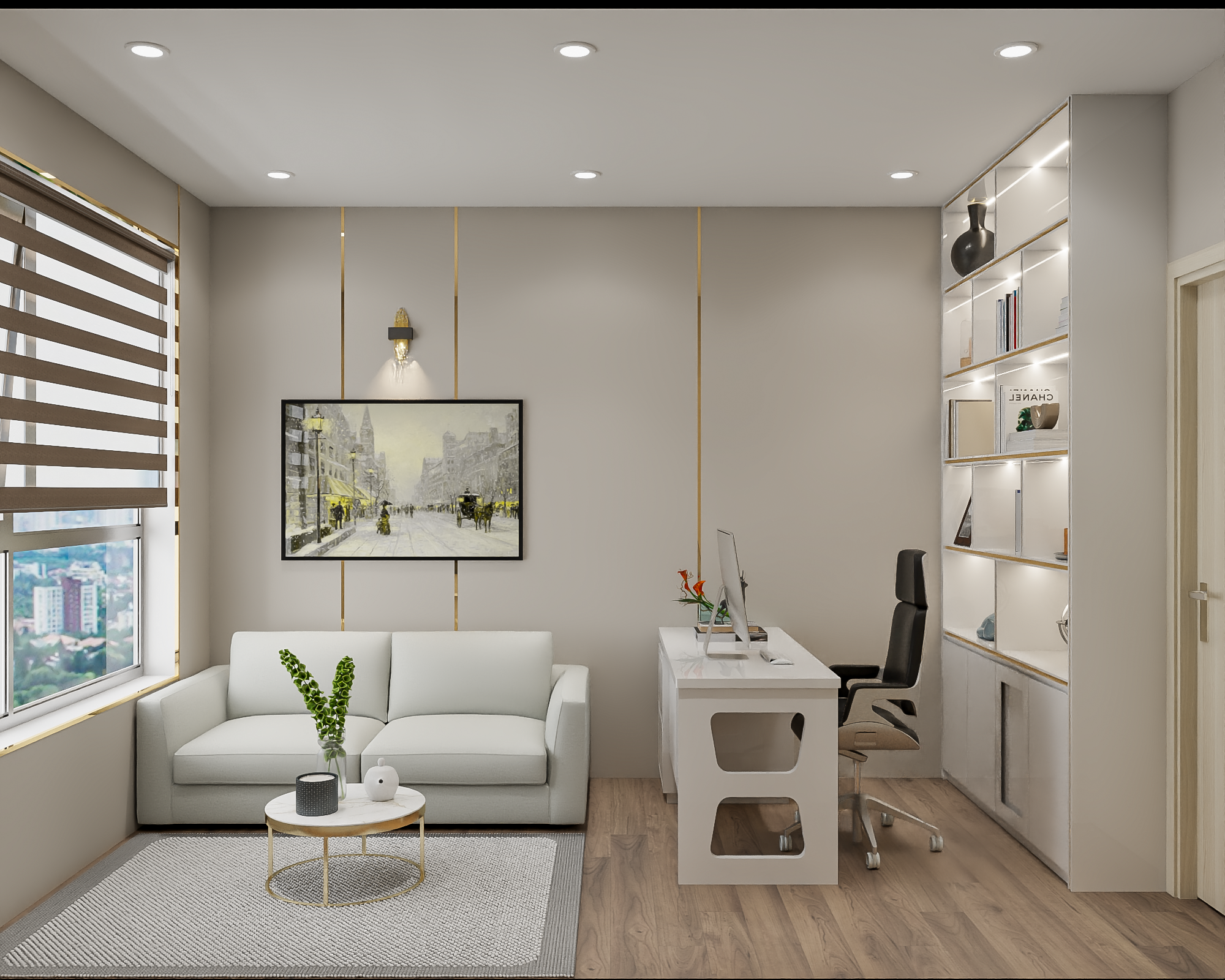 - Tường màu trắng sáng, điểm nhấn là các đường viền mạ vàng tạo sự sang trọng và nổi bật.