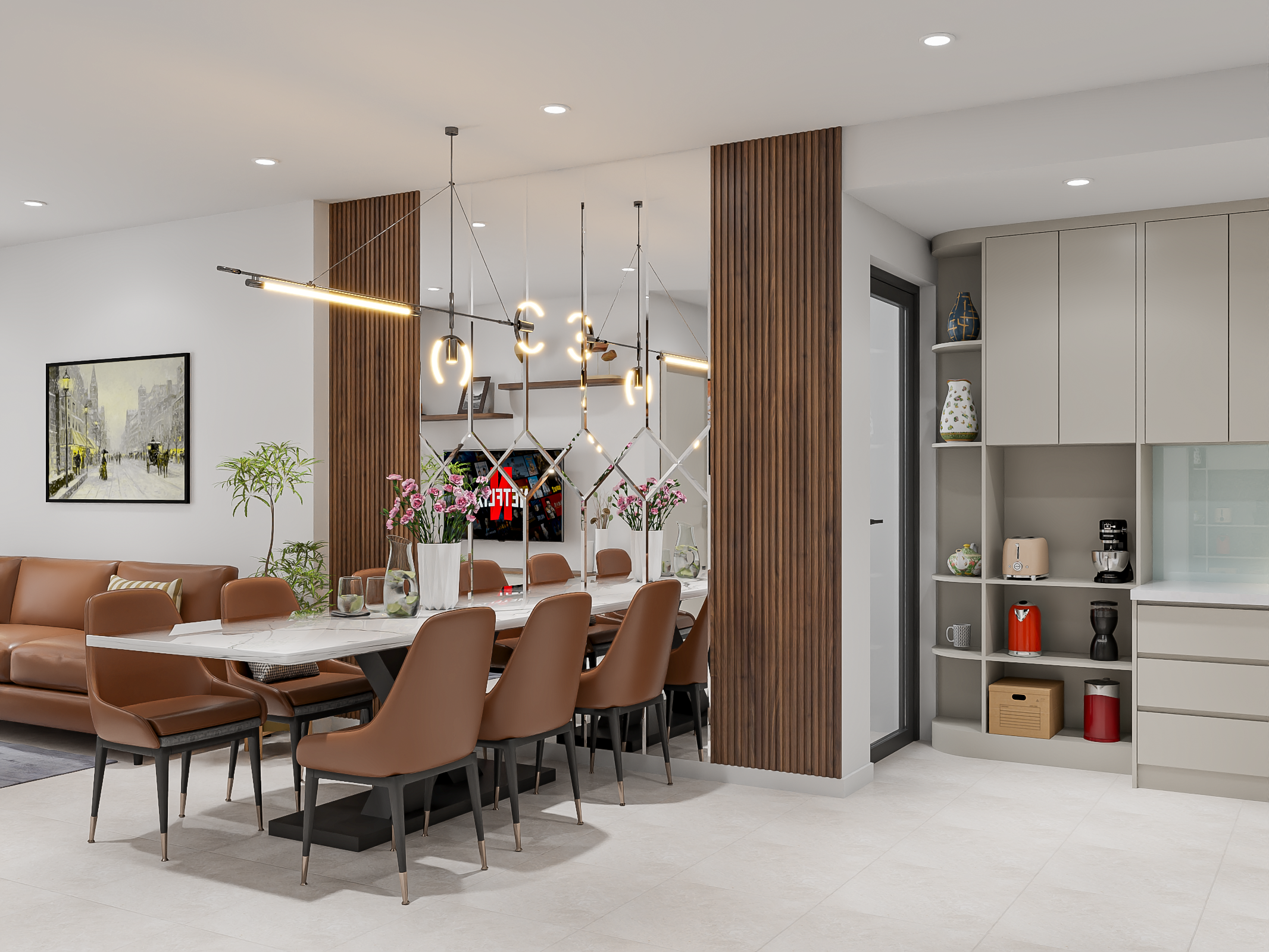 - Phòng khách sử dụng bàn ăn bằng đá màu trắng sáng, kết hợp với ghế tựa bằng da màu nâu ấm, tạo cảm giác sang trọng và dễ chịu. Tường và tủ kệ màu trung tính, nổi bật với các chi tiết trang trí màu sắc nhẹ nhàng.