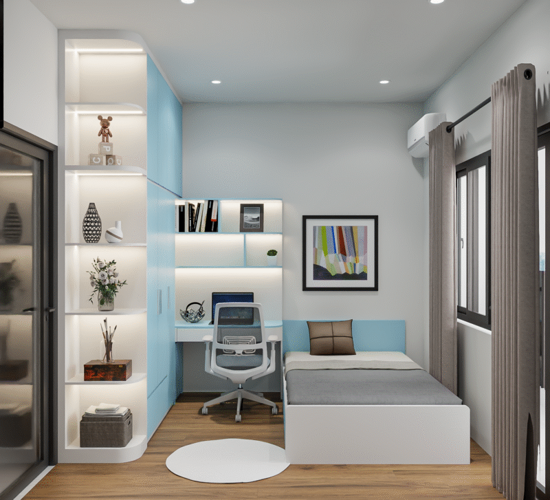 - Tổng thể căn phòng mang đến cảm giác trẻ trung, gọn gàng, hiện đại, phù hợp cho người trẻ hoặc phòng ngủ con trong căn hộ hiện đại.