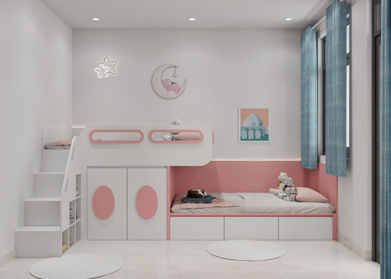 - Thiết kế nội thất phòng ngủ cho bé của không gian này mang phong cách hiện đại, trẻ trung và dễ thương, phù hợp cho phòng của trẻ nhỏ.
