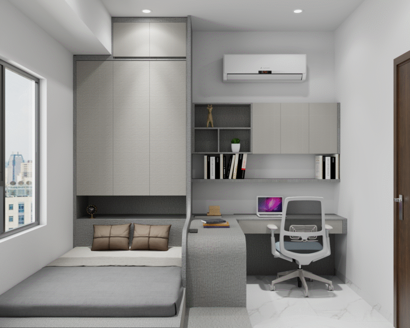 - Giường ngủ: Thiết kế đơn giản, nhỏ gọn, có đầu giường tích hợp kệ để sách hoặc đồ trang trí nhỏ. Gối và chăn màu trung tính tạo cảm giác ấm cúng, thoải mái.