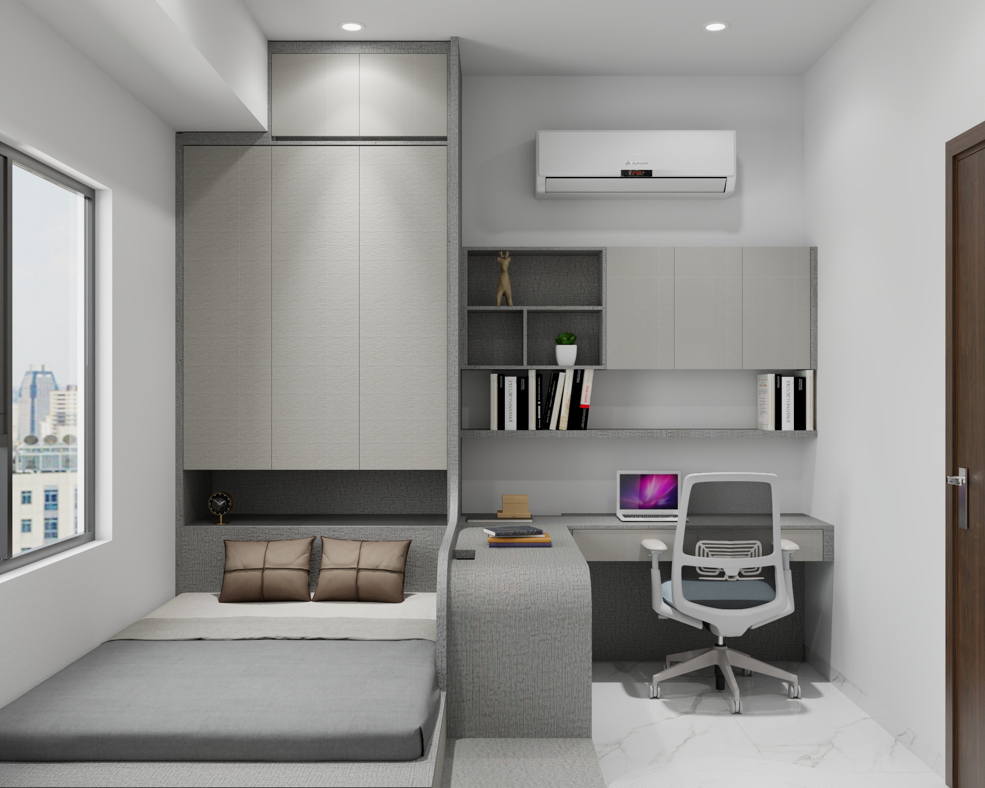 Phòng ngủ thiết kế hiện đại, tối ưu hóa công năng, tạo cảm giác thoải mái, yên tĩnh, phù hợp cho sinh hoạt, học tập và nghỉ ngơi. Sự kết hợp hài hòa giữa màu sắc, nội thất và ánh sáng giúp không gian trở nên tiện nghi, ấm cúng và dễ chịu.