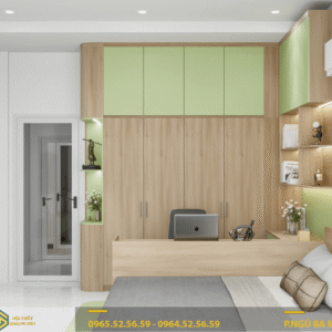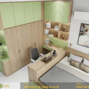 Nội thất phòng ngủ cho ba mẹ hiện đại với đầy đủ tiện nghi gồm: Bàn làm việc chữ L, giường phản, tủ quần áo, kệ sách, kệ tivi. Thích hợp cho các cặp vợ chồng yêu thích sự tiện nghi, hiện đại, bên cạnh đó gam màu xanh tạo sự nhẹ nhành, tươi mát cho căn phòng ngủ.