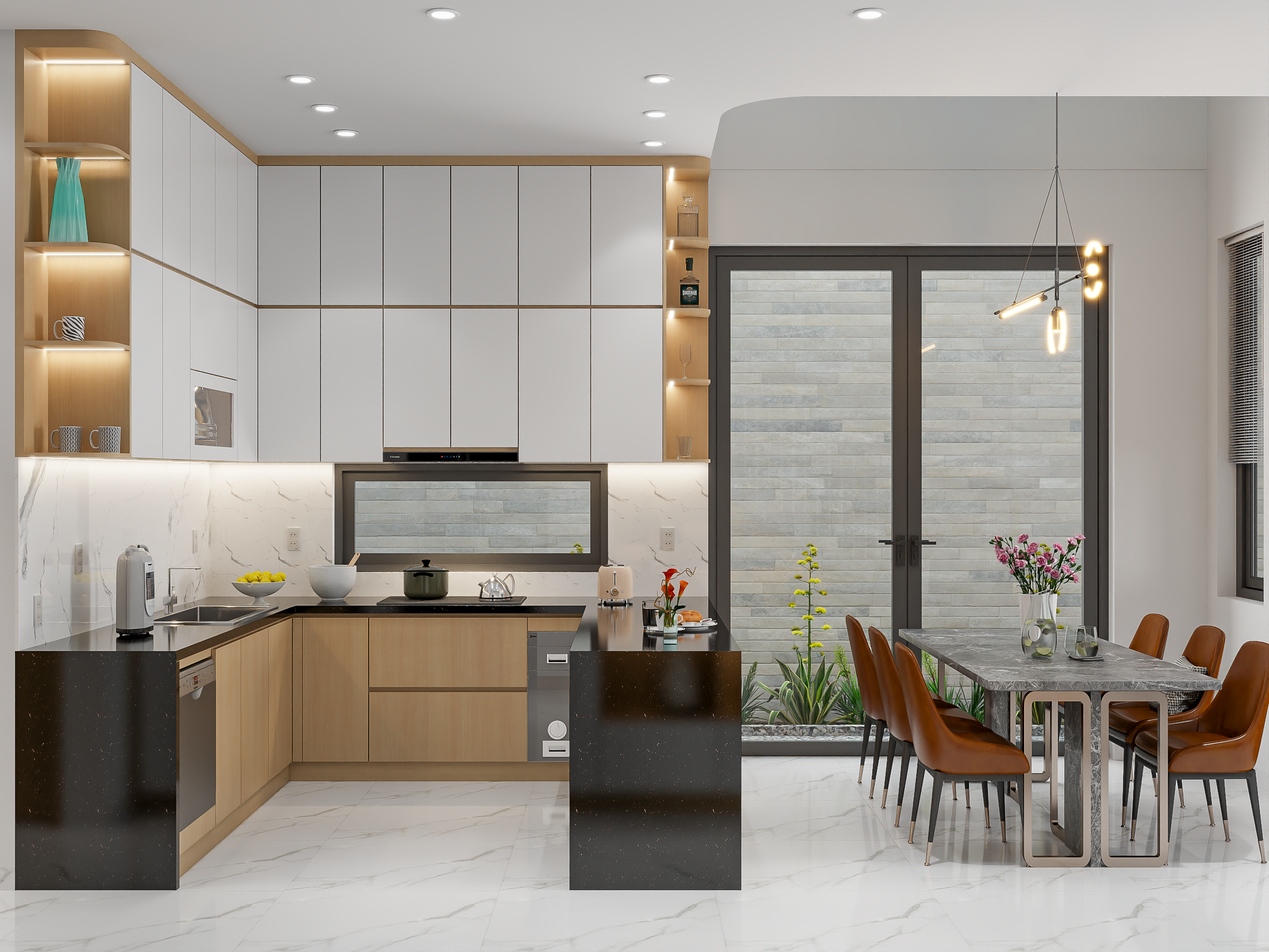 - Thiết kế hệ tủ bếp chữ L kết hợp tủ màu trắng và tủ dưới giả gỗ giúp tối ưu hoá không gian lưu trữ mang lại sự gọn gàng và tiện nghi cho gia đình