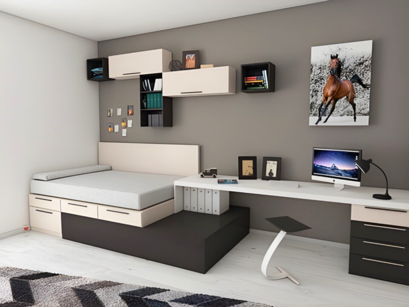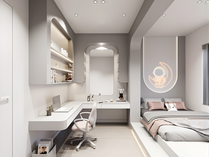 - Ưu tiên công năng sử dụng: Kết hợp bàn làm việc nhỏ, kệ treo tường hoặc hộc lưu trữ dưới giường để đáp ứng nhu cầu sinh hoạt cá nhân.