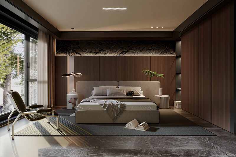 - Bố trí nội thất tối giản: Giường ngủ kích thước vừa phải, tủ quần áo âm tường hoặc tủ cao sát trần giúp tiết kiệm diện tích sàn.